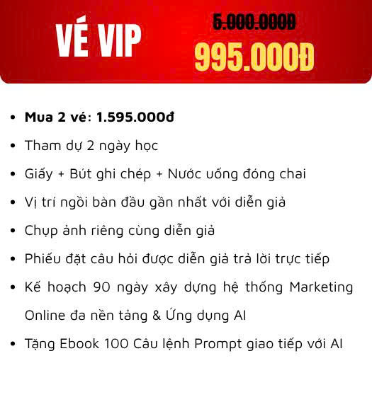 Đây là khoá học kết hợp giữa 2 tư duy: Chuyên gia Marketing Online – Ứng dụng AI Th.S Lê Diên Tiến và chuyên gia TikTok Vi Ngọc Lan cung cấp cho bạn giải pháp để giải quyết các vấn đề trên.